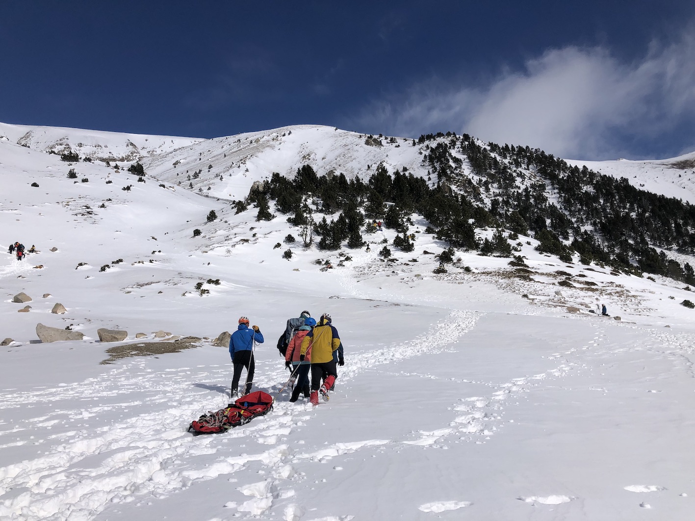 Set víctimes d'una allau en quatre escenaris diferents, aquesta és la situació amb la qual s'han trobat els participants del curs de medicina de rescat de muntanya que s'està duent a terme a Vallter. Enguany, amb una novetat, i és que les víctimes són persones i no pas ninots com en les anteriors edicions. Els alumnes d'un centre de Barcelona s'han acostat a l'estació per formar part de la proposta i colgar-se sota la neu a l'espera de ser rescatats. L'objectiu és que la vintena de participants, tots metges, infermers o bombers, aprenguin com aplicar els seus coneixements en condicions adverses, sota una climatologia complicada i amb material especialitzat. «Com assistir a persones en llocs remots o de muntanya, de difícil accés, amb poc material i recursos, però amb les garanties suficients per assistir als accidentats, i si no és en aquell moment, que es pugui fer després d’haver-los traslladat», explica el coordinador del curs, Joan Casadevall.