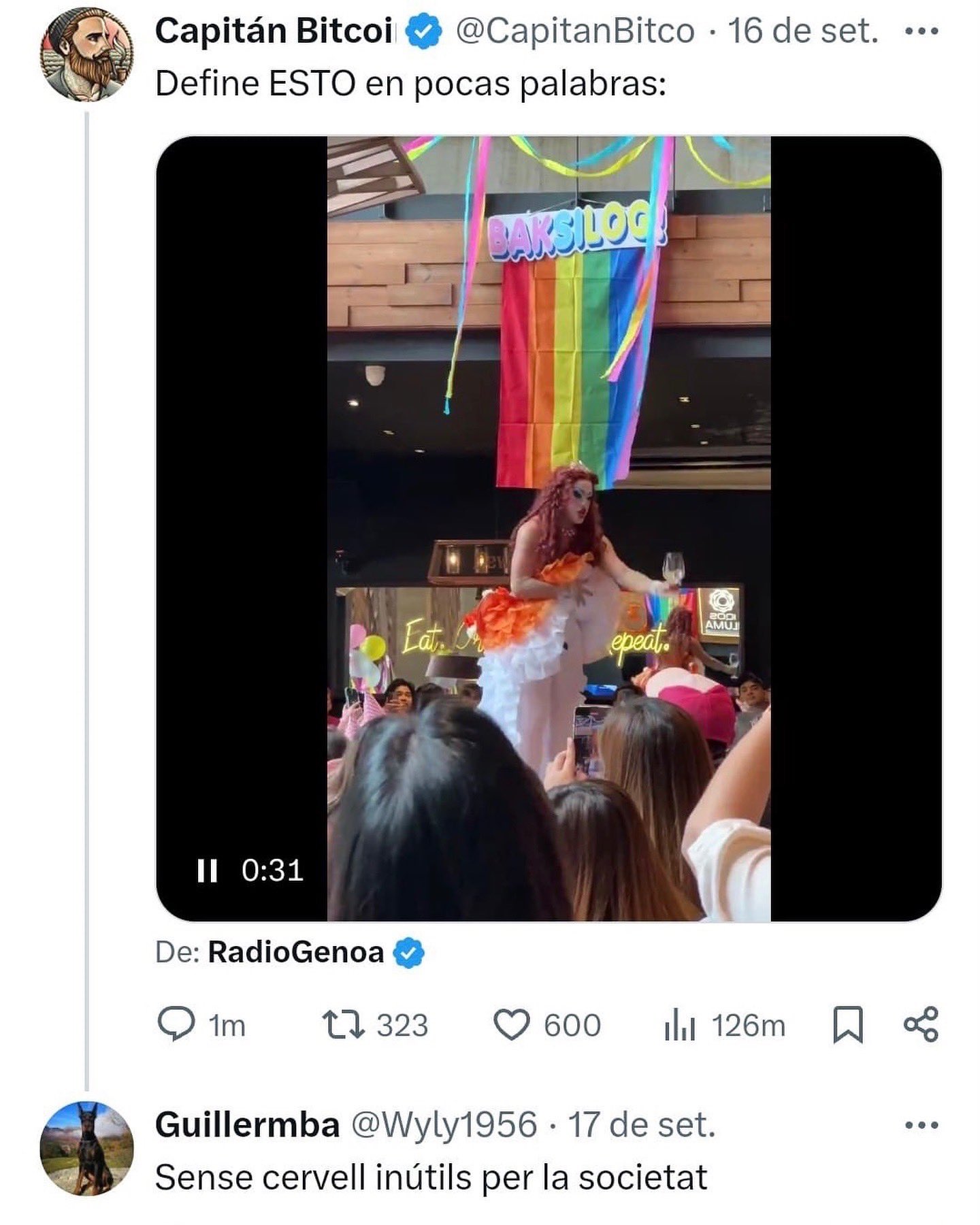 ERC i la CUP de Ripoll exigeixen responsabilitats després d'un missatge a la xarxa X del segon tinent d'alcalde i regidor d'Aliança Catalana, Guillem Barranqueras, contra la comunitat LGTBIQ+. El missatge data del 17 de setembre. Era una resposta a una imatge d'un espectacle amb una drag-queen que fa veure que serveix vi des dels seus genitals en un xou amb públic. En l'espectacle es veu com omple copes dels assistents. Un altre compte se'n feia ressò tot dient: 'Defineix això en poques paraules'. El regidor contesta: "Sense cervell, inútils per a la societat". Les dues formacions a l'oposició han exigit responsabilitats davant del missatge del regidor que consideren intolerable.