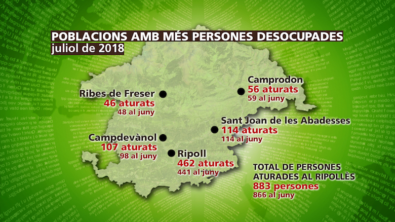 El tercer trimestre del 2018 ha començat amb un ascens de l’atur, després de tancar el segon amb un dels descensos més notables dels últims temps al Ripollès. L’Observatori de Treball i Model Productiu de la Generalitat de Catalunya indica que el juliol es va tancar amb 883 aturats.. Això suposa un augment de 17 persones a les llistes de l’oficina de treball de Ripoll respecte al juny, que es va tancar amb 866 aturats. La bona notícia és que l’atur registrat es manté per segon mes consecutiu per sota de les 900 persones sense feina.